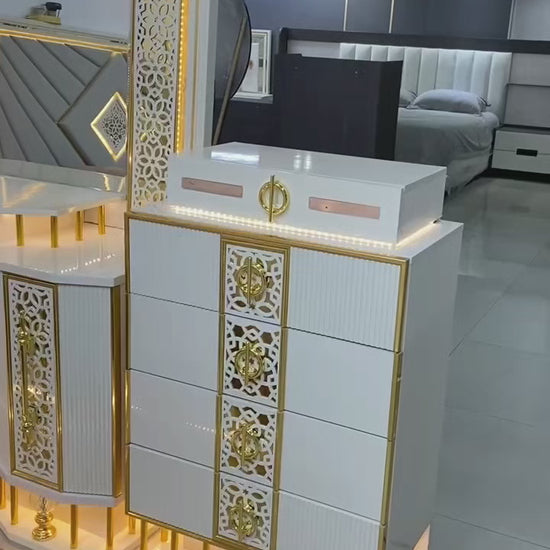 Indulge in opulent comfort with our white and gold-accented bedroom suite, where contemporary glamour meets timeless sophistication. This exquisite 5-piece collection transforms your bedroom into a five-star sanctuary.