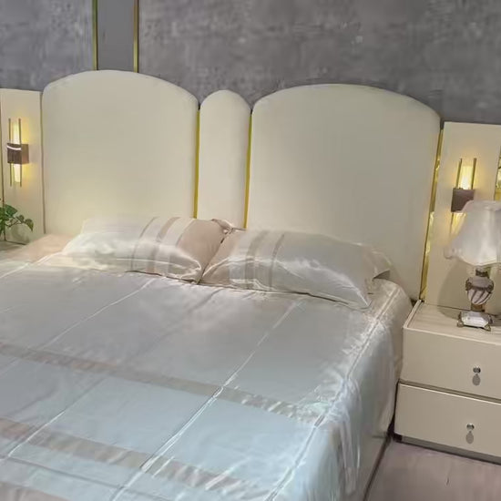 Transform your bedroom into a luminous retreat with our white and gold-accented bedroom set, where crisp modernity meets timeless glamour. This 5-piece ensemble delivers understated luxury through its pristine white surfaces and delicate gold detailing, perfect for creating a serene yet sophisticated sanctuary.